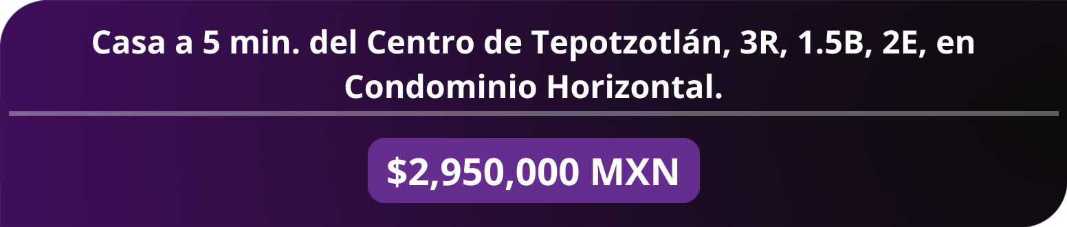 Casa a 5 min del centro de Tepotzotlán, Estado de México, muy acogedora y dentro de Condominio Horizontal. Consta de: 3 Recámaras, 1.5 Baños, Sala-Comedor de muy buen tamaño, Cocina integral, 2 Lugares de estacionamiento, cisterna y Patio trasero amplio. Excelente estado y documentos en regla. Se aceptan créditos bancarios, Infonavit o recurso propio.